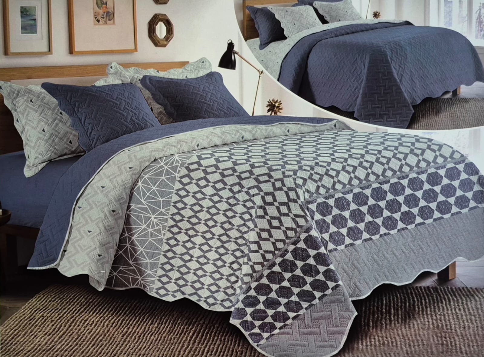 Elegante Cubrecama reversible doble faz, Tonos Azul y Gris que puedes usar en ambos lados.